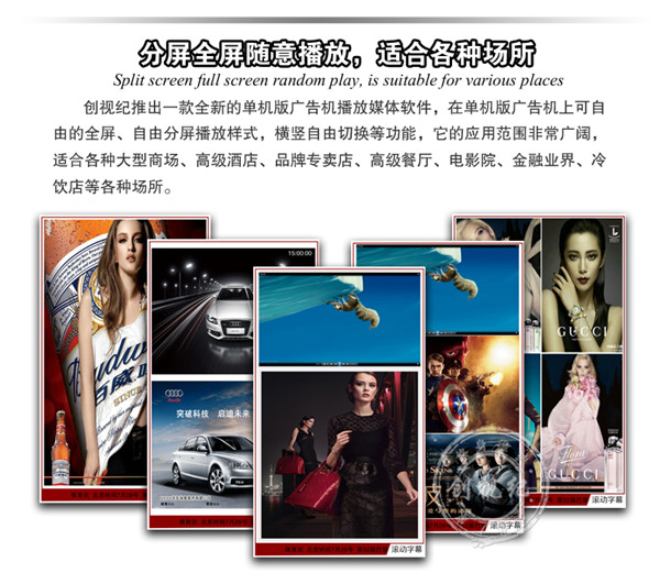 對(duì)比性 | 看家本領(lǐng): ★成本低,能滿足常規(guī)的廣告機(jī)播放功能; ★高清1080P視頻、圖片播放; ★一鍵拷貝節(jié)目、支持 HDMI接口輸入,可當(dāng)顯示器之用。不足之處:豎屏片源需要第三方軟件制作、剪輯。分屏制作繁瑣。 | 看家本領(lǐng): ★解決客戶橫豎屏轉(zhuǎn)換問題,可自動(dòng)對(duì)應(yīng)機(jī)器旋轉(zhuǎn)視頻; ★內(nèi)置4G內(nèi)存,烤貝快、播放穩(wěn)定、永不卡殼; ★真正客戶自由分屏,真正的實(shí)現(xiàn)視頻,圖片,字幕,日期的隨機(jī)組合;想怎么分就怎么分; ★目前唯一能真正實(shí)現(xiàn)節(jié)目之間的無縫切換的方案; ★疊加背景圖片,使畫面更美觀; ★雙芯片、真正1080P的全高清解碼;目前只有我們和分眾傳媒使用此方案。 | 看家本領(lǐng): ★遠(yuǎn)程控制、管理、下發(fā)節(jié)目; ★兼容更多格式,天氣預(yù)報(bào)等,內(nèi)容豐富,操作so easy! ★后臺(tái)軟件功能強(qiáng)大,關(guān)鍵點(diǎn)是穩(wěn)定,支持同時(shí)上萬終端在線; ★隨機(jī)搭配服務(wù)器安裝軟件; ★擴(kuò)展性強(qiáng)、可安裝任意APP,滿足你的任何任性; ★支持阿里云服務(wù)器,強(qiáng)大的技術(shù)支持。真正的廣告媒體運(yùn)營(yíng)最佳選擇,穩(wěn)定壓到一切。不足之處:暫時(shí)沒有(這個(gè)可以有,這個(gè)真沒有...) |