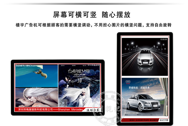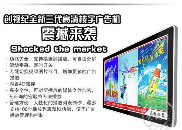 1、機器板貼4G內存,播放更流暢2、任意自由分屏3、橫版視頻自動旋轉成豎版4、視頻圖片無縫切換,節省更多的播放時間,為你賺更多的廣告費5、海量行業模板贈送6、支持背景疊加從而廣告節界面更加美觀/以上為創視紀廣告機行業獨有功能,豎屏機不需為重新制作豎式節目而煩,廣告機功能最大化,十分人性化,便捷