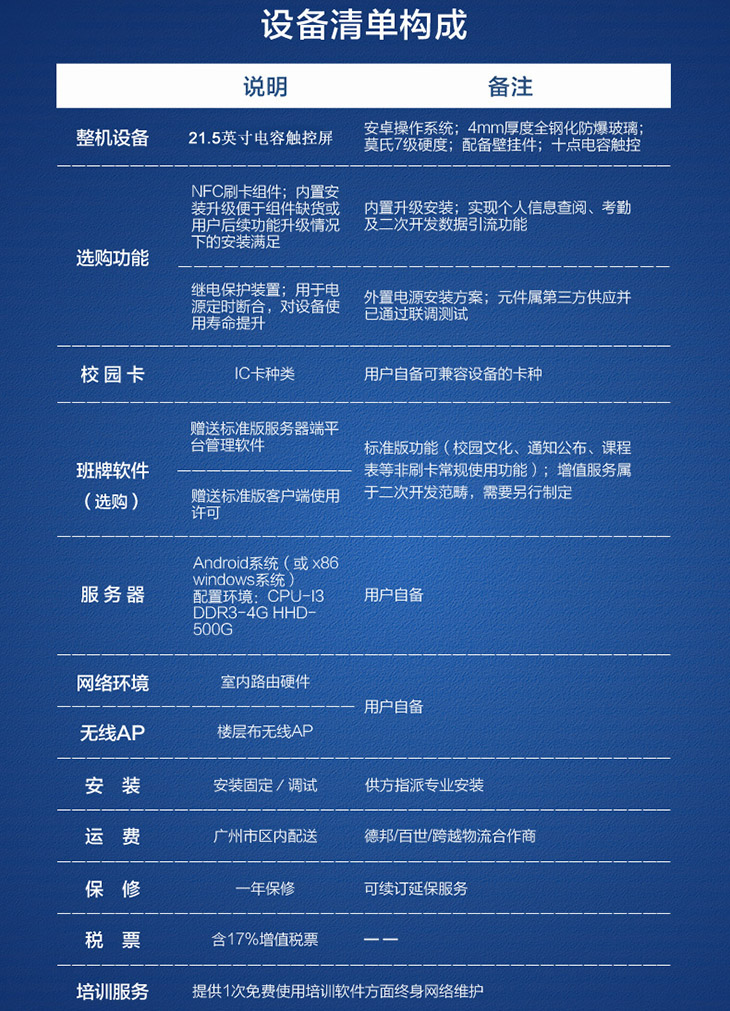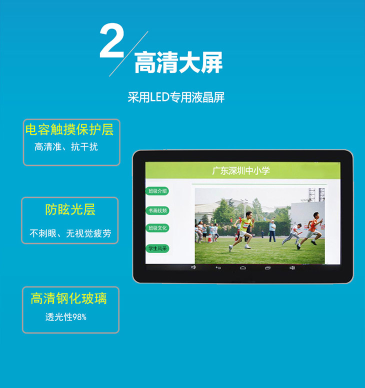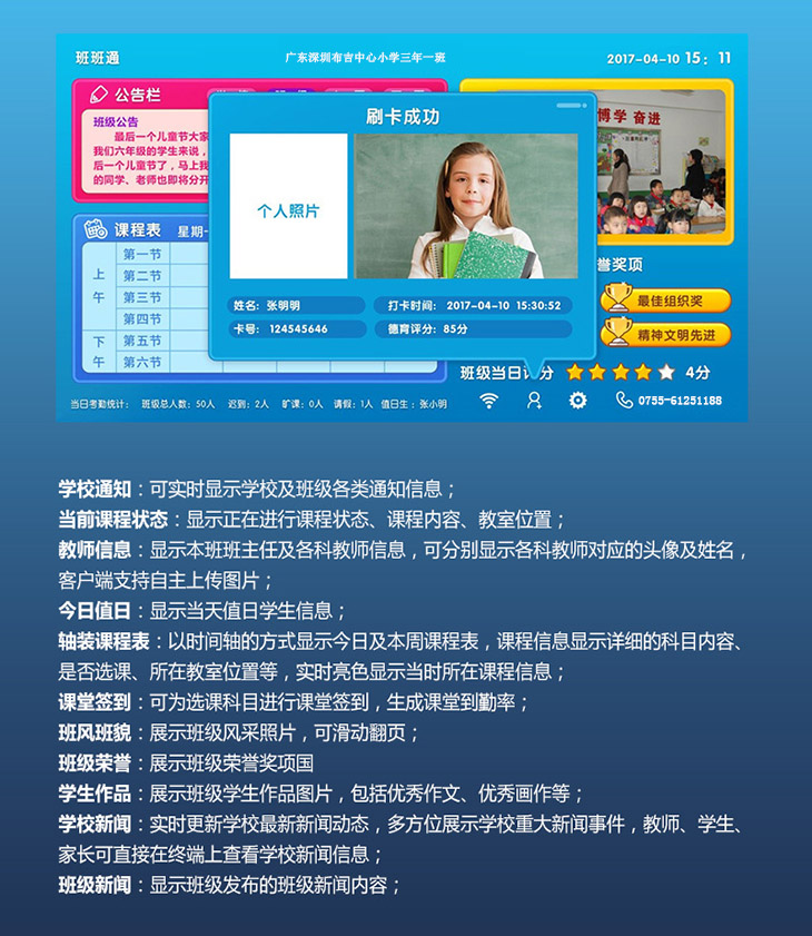 基礎(chǔ)數(shù)據(jù)庫系統(tǒng)是按照教育行業(yè)設(shè)計的標(biāo)準(zhǔn)數(shù)據(jù)庫,包括學(xué)校信息、教師信息、教室信息、學(xué)生信息、課程信息、班風(fēng)班貌、德育評價、考試信息、考勤信息等,通過建設(shè)基礎(chǔ)數(shù)據(jù)庫系統(tǒng)可為教育信息化建設(shè)打造堅實基礎(chǔ)。產(chǎn)品備注:電容觸摸,可選擇帶刷卡功能或不帶刷卡功能,備貨尺寸:15.6寸、18.5寸、21 5寸,其他尺寸可訂做。