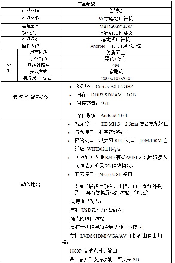 液晶屏尺寸       65寸 TFT 液晶顯示屏