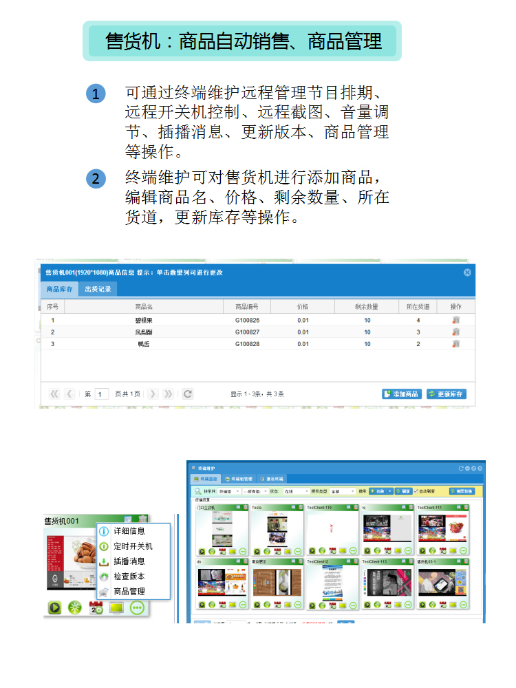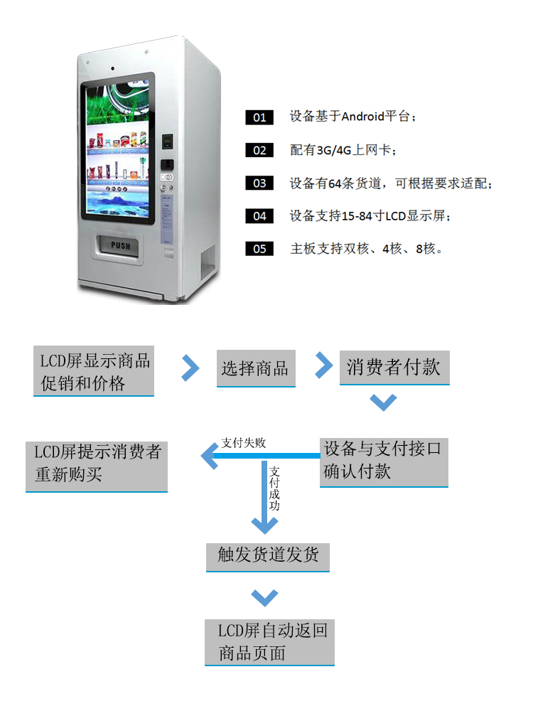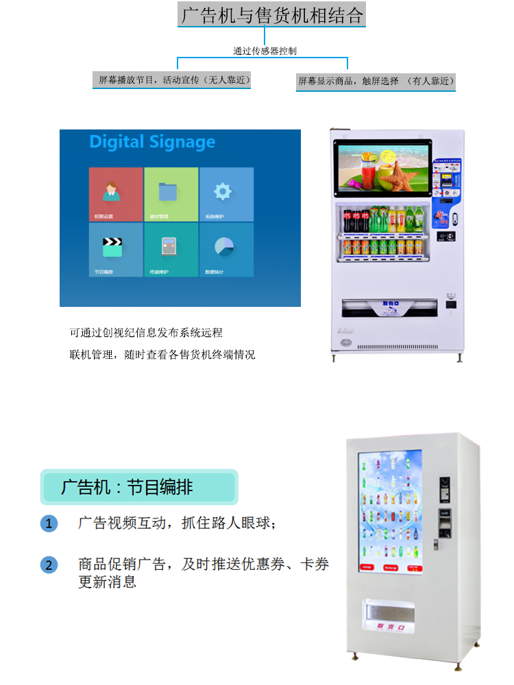 設備不僅僅具有售貨功能,更能遠程聯機對各終端進行操作和管理,同時,個性的LCD廣告顯示屏播放商品廣告,及時推送消息,更具多元化、高定制化的特點。贏得眾多商家的喜愛,