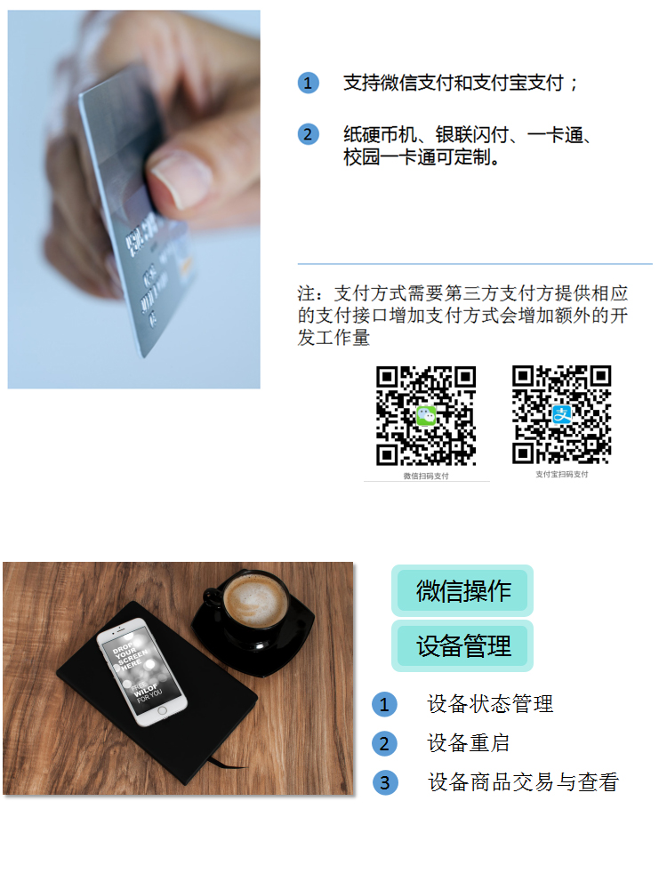 目前市場上已經成熟推出,飲料自動售貨機,景區自助售取票機,咖啡飲料飲水一體機,盒飯自動販賣機,